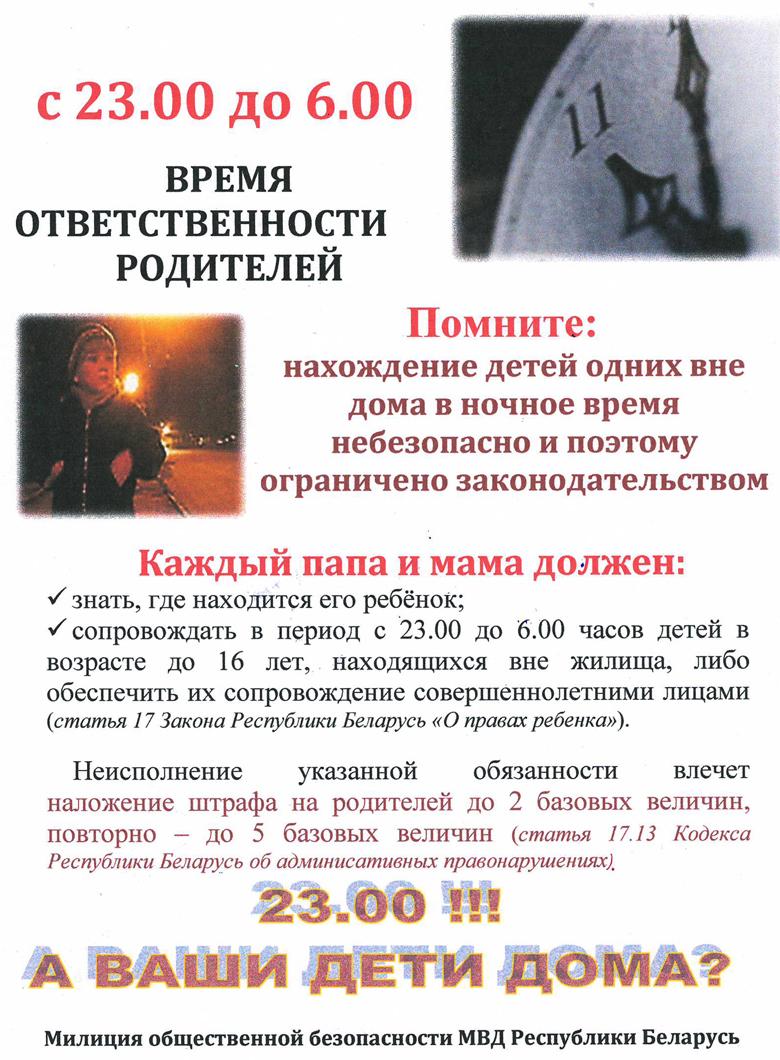 В Республике Беларусь действует запрет на нахождение несовершеннолетних в возрасте до 16 лет в общественных местах с 23.00 до 06.00 без сопровождения взрослых.